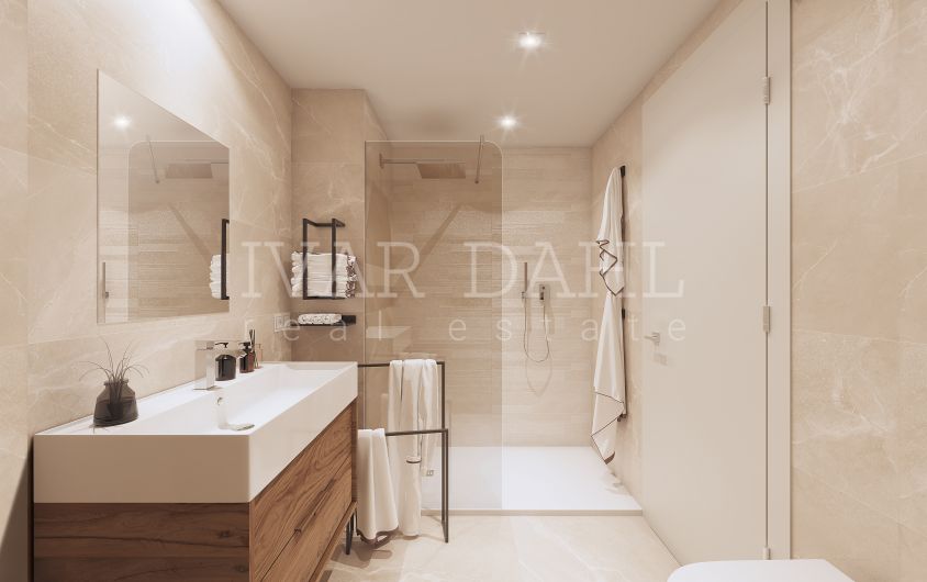 Neubau i Benahavis Centro, Benahavis. Denna fastighet har följande faciliteter: Bergsida, Utomhuspool, Garage, Hiss, Solpaneler, Bergsutsikt, Luftkonditionering, Solarium, Gatuvy, Nära golf, Aerothermia, Förinstallation för elfordon och Bekvämligheter nära.