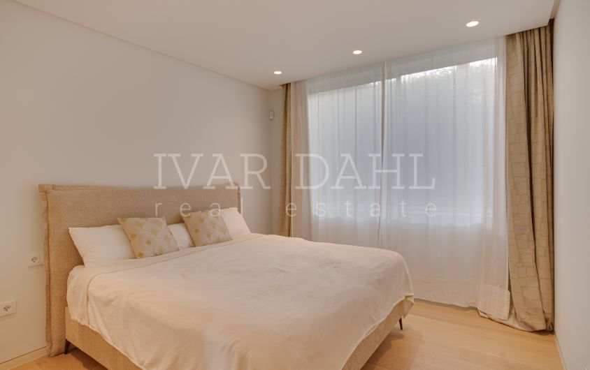 The apartment features two spacious bedrooms, including one with an en-suite bathroom, complemented by an additional bathroom and a guest toilet. Every corner of the home exudes quality, with underfloor heating throughout, air conditioning, and an overall excellent condition. The thoughtfully designed layout ensures comfortable living, while the addition of a guest room and storage room provides practicality.