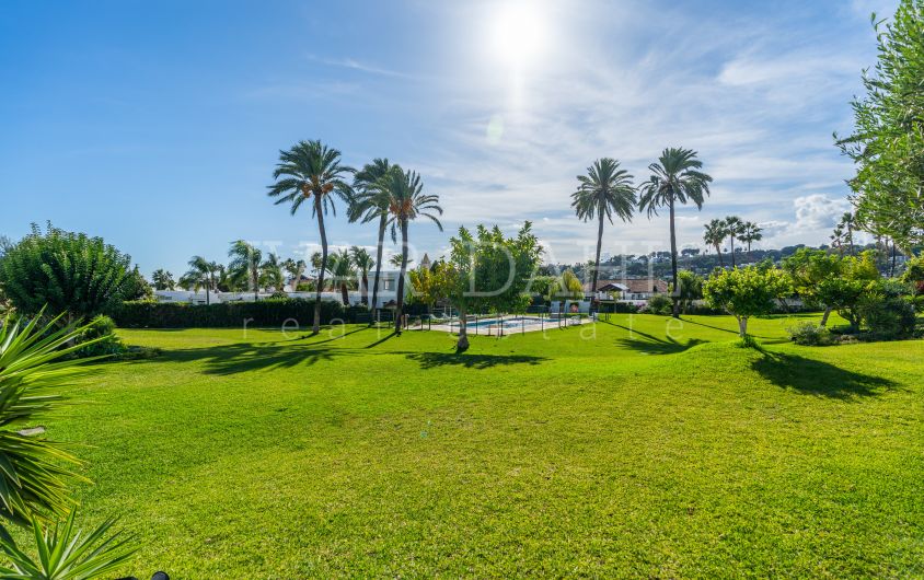 The charming Andalusian-style gated urbanization boasts expansive mature gardens with palm trees, a large swimming pool, and a covered carport parking lot, also gated.