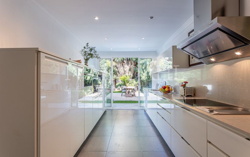 The fully equipped kitchen boasts top-of-the-line Gaggenau appliances and offers direct access to the garden, where you will find a delightful outdoor dining area ideal for al fresco meals and entertaining.