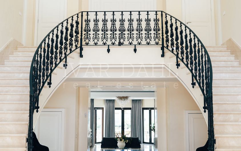Upon entering, you’re welcomed by a striking double staircase and high ceilings that set the tone for the home’s grandeur. The main level is crafted for both comfort and lifestyle, featuring a stylish office, dual kitchens, open-plan living and dining spaces, and a seamless flow to expansive terraces. Wellness and leisure are at the forefront, with a heated saltwater pool, private gym, Turkish-style steam room, and cinema room.