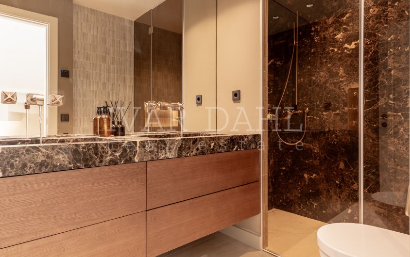 The upper levels of the home accommodate four spacious bedrooms and three well-appointed bathrooms, alongside a guest toilet for convenience. The master suite and additional bedrooms are designed for privacy and comfort, with tasteful finishes throughout. Additional features include a versatile basement, an inviting solarium offering partial sea and mountain views, and both covered and uncovered terraces providing versatile spaces to enjoy Marbella’s enviable climate.