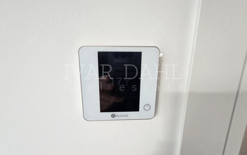 Outdoors, residents benefit from a private swimming pool and landscaped garden, both designed for luxury living. The carport provides secure parking, while the gated community offers a 24-hour security service, surveillance cameras, and a secure entry system, ensuring peace of mind at all times. Comfort is further enhanced by underfloor heating in the bathrooms, individual air conditioning units throughout, and aerothermic technology for energy efficiency. Generous fitted wardrobes and a walk-in closet offer plentiful storage.