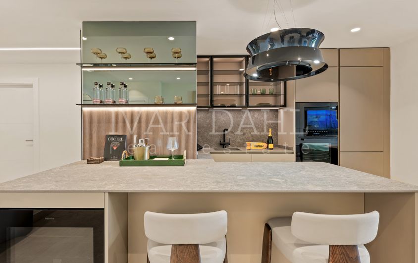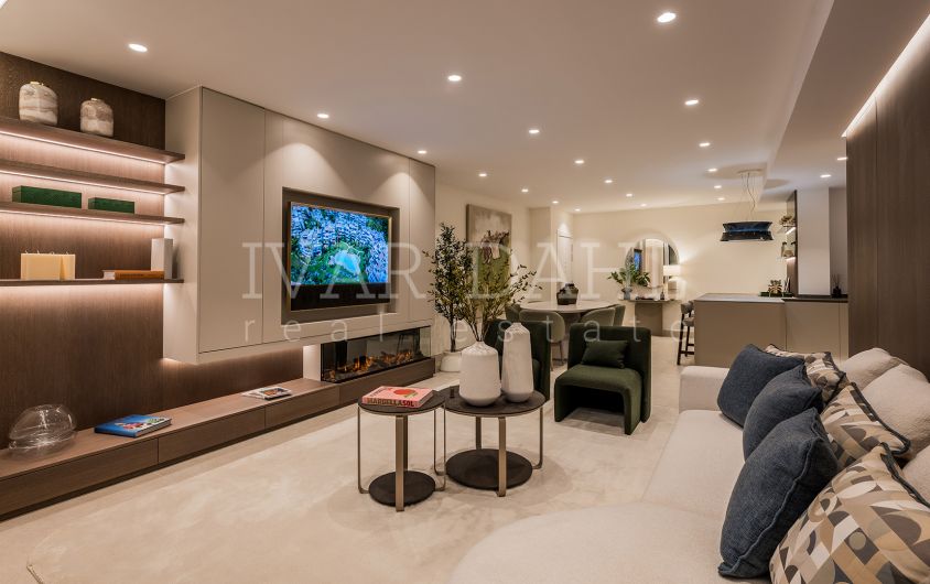 Three spacious bedrooms and two modern bathrooms provide ample accommodation, with the master suite benefitting from a walk-in wardrobe and direct access to the terrace. Each room is enhanced with underfloor heating and individual A/C units, while fitted wardrobes ensure abundant storage. The apartment has been recently renovated to the highest standards, ensuring a turn-key, move-in ready residence that balances comfort and luxury.