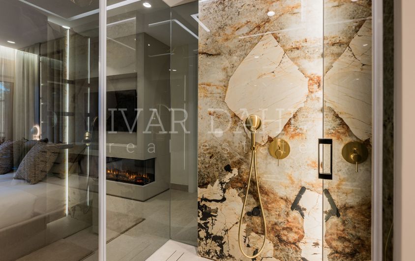The apartment spans a generous built area of 153m², with 126m² of stylish interior space and a 27m² private terrace. The bright and airy living area seamlessly connects to the dining room and features an electric fireplace, B&O sound system, and triple-glazed windows for both comfort and serenity. The fully furnished apartment is equipped with a brand new, fully fitted kitchen, highlighted by advanced features including an invisible hob, Thermomix, wine fridge, and high-end appliances. Additional conveniences such as a utility room, hidden laundry, and Japanese toilets add to the sense of sophistication.