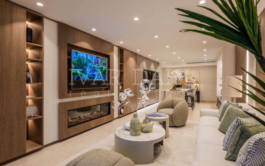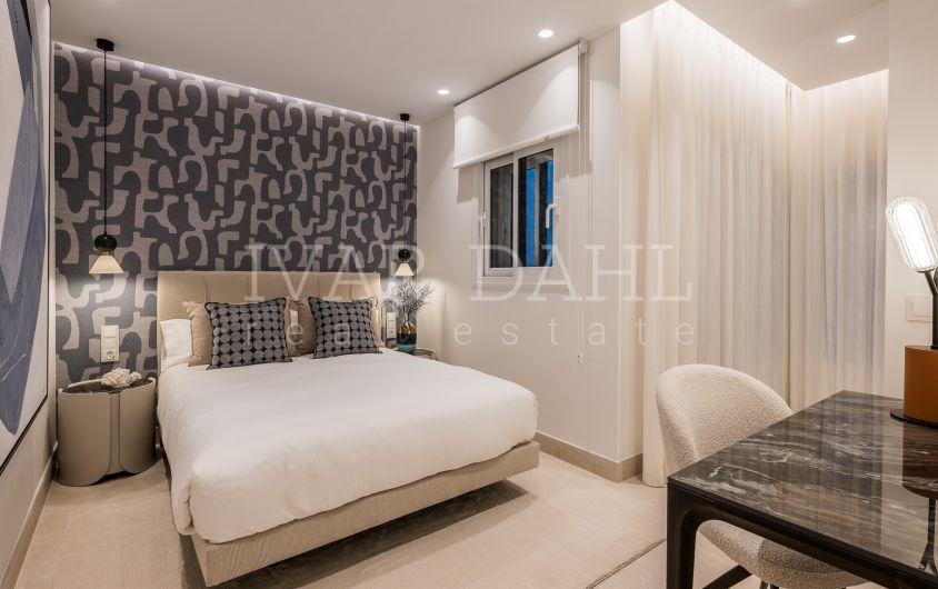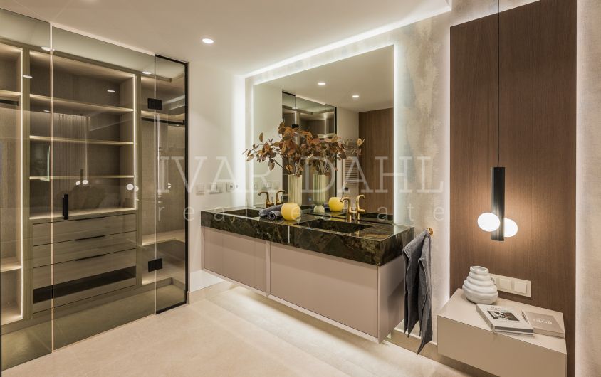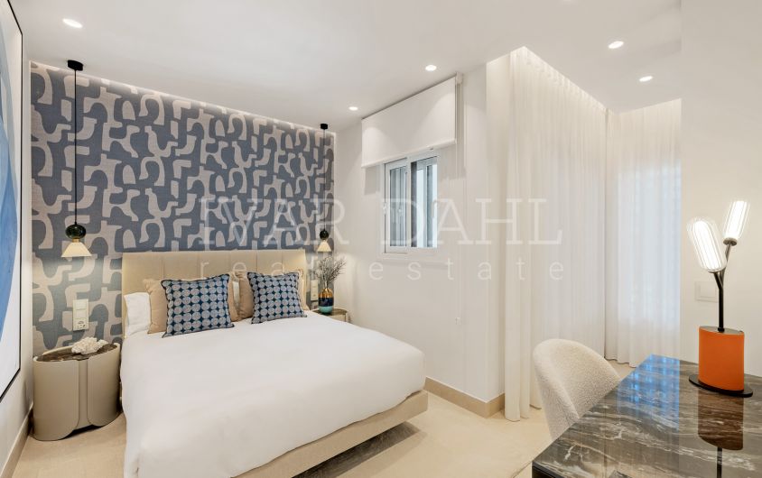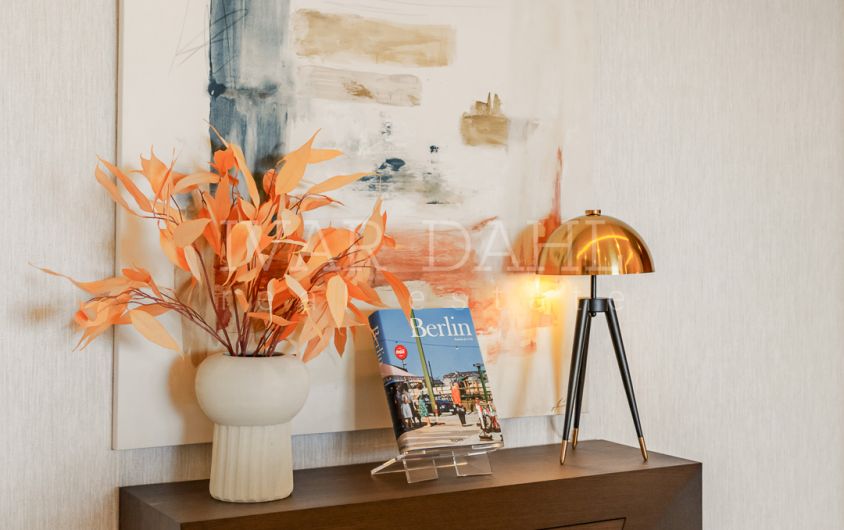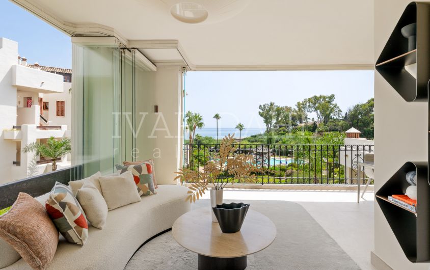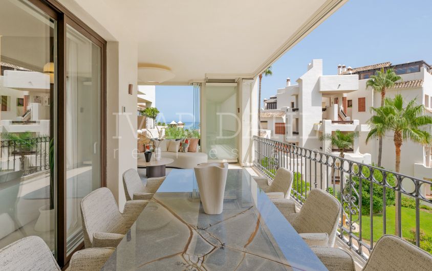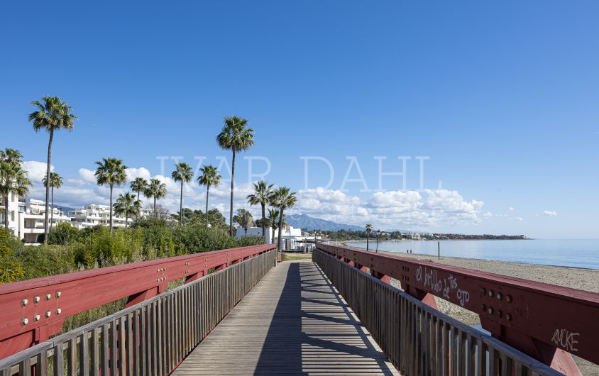 This top quality, frontline beach apartment is situated in the exclusive Bahía del Velerín area of Estepona East, Malaga. Boasting a prime position with direct access to the sea, the property offers sweeping panoramic views of the Mediterranean and beautifully landscaped communal gardens. Recently renovated to the highest standards, this luxury apartment combines contemporary design with exquisite finishes, providing a sophisticated and comfortable living environment.