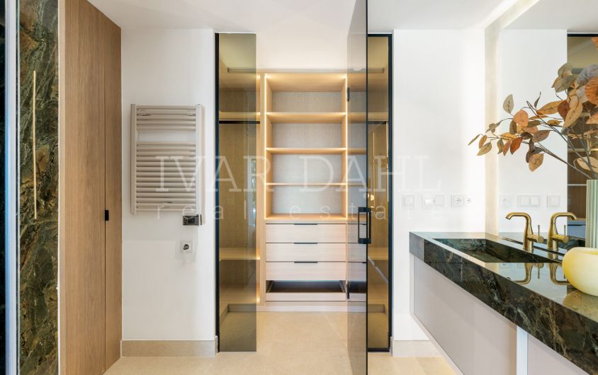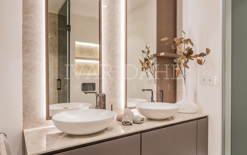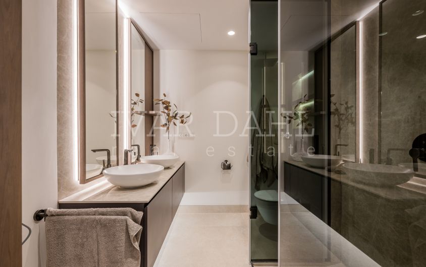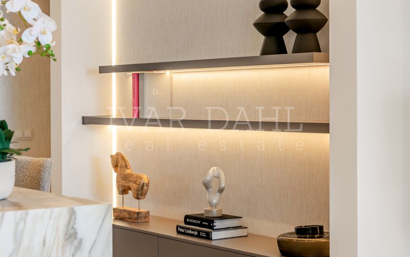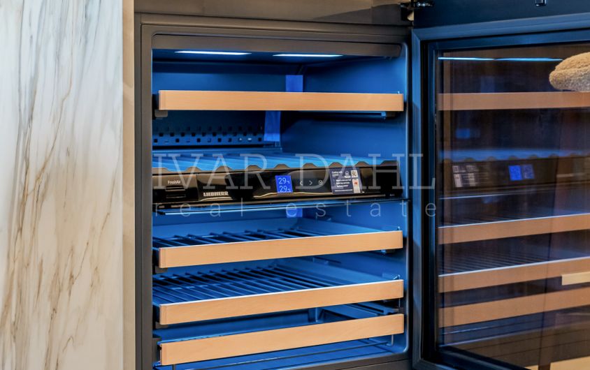 Designed with both style and functionality in mind, the fully fitted kitchen is equipped with the latest appliances including a Thermomix, wine fridge, invisible hob, and utility room. A hidden laundry area adds to the property’s sleek appearance. Smart home technology, a Dolby Stereo Surround system, B&O sound system, individual A/C units, and a security entrance with an armoured door provide a modern, secure lifestyle. Residents also benefit from a lift, a private garage, storage room, and included parking space.