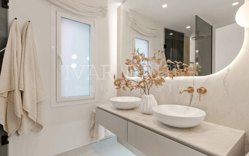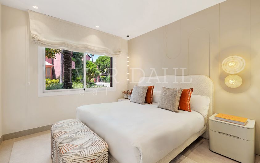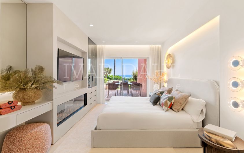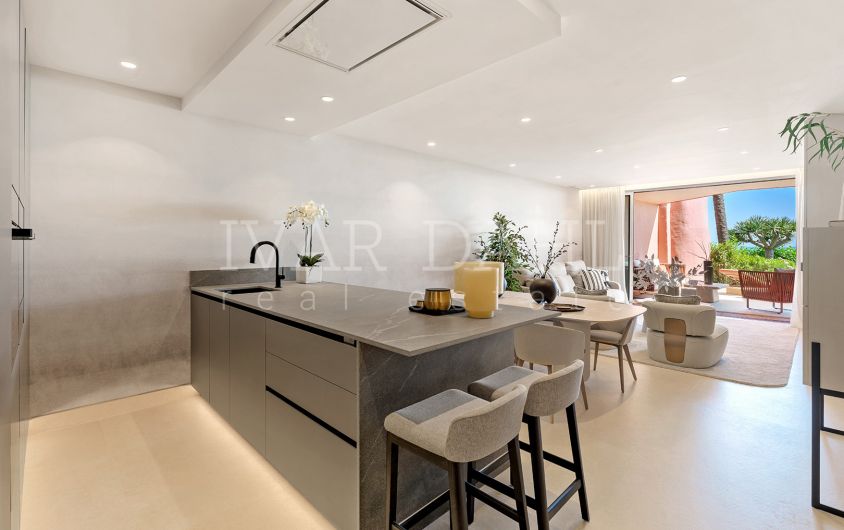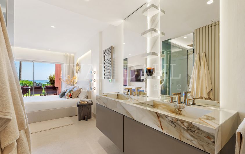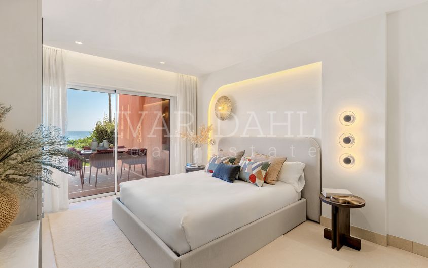Presenting a superbly appointed ground floor apartment situated in the distinguished Menara Beach enclave, Estepona East, Malaga. This recently renovated luxury residence forms part of a highly sought-after gated community on the New Golden Mile, providing direct access to the beach and offering expansive, uninterrupted sea views. With a total built area of 172m², including 130m² of elegant interiors and a generous 42m² private terrace, this property exemplifies contemporary coastal living.