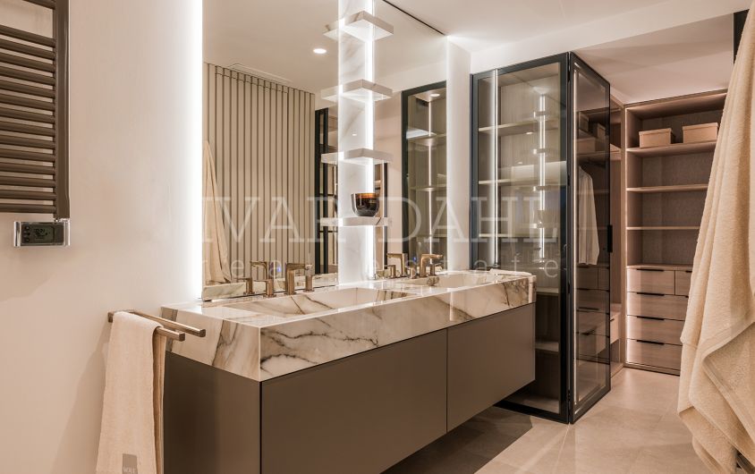 Designed for both comfort and sophistication, the property is fully furnished and equipped with a state-of-the-art smart home system, individual A/C units, and a sophisticated Dolby Surround Sound and B&O sound system. The fully fitted kitchen boasts high-end appliances, including a wine fridge, invisible hob, Thermomix, and electric fireplace, catering to every culinary need. Porcelain floors, an armored door, and a security entrance add to the feeling of exclusivity and safety, complemented by 24-hour security service, surveillance cameras, and concierge service within the community.