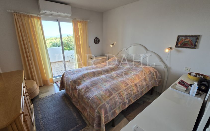 Additional amenities include air conditioning, fitted wardrobes, marble floors, a laundry room, and a solarium. The penthouse is delivered fully furnished and is in good condition. It is located in a gated complex with a lift, mature gardens, and an attractive, impeccably maintained communal swimming pool, as well as access to on-site parking. The development ensures tranquility and privacy while benefiting from its proximity to playgrounds, restaurants, shops, shopping centers, a tennis club, a 9-hole golf course, a gym, and a wide range of other services.