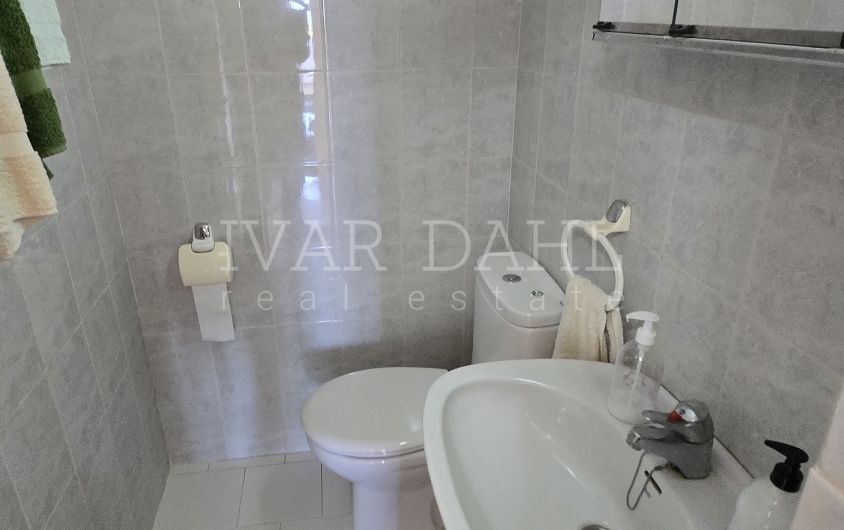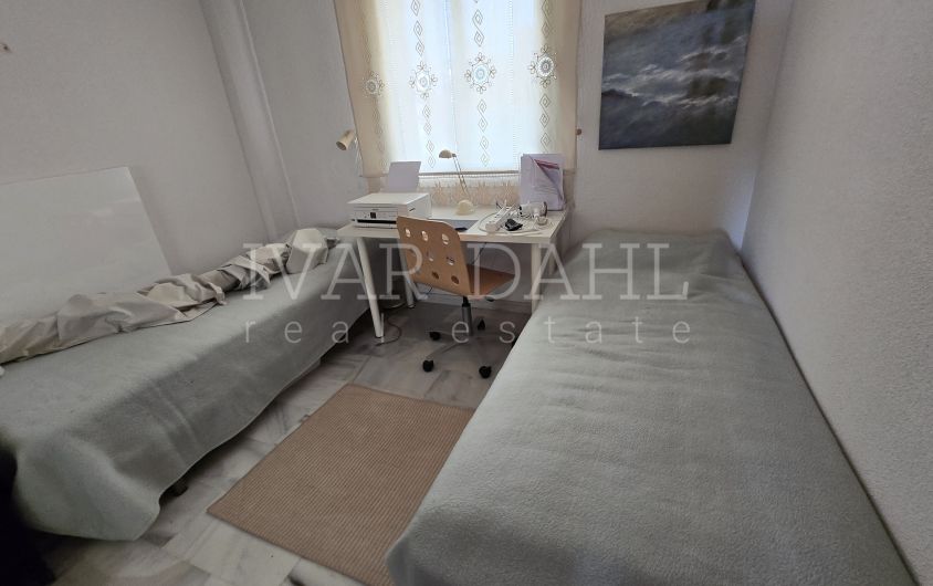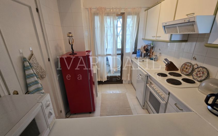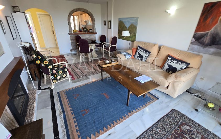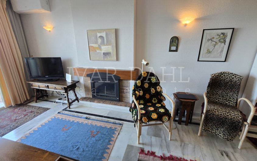 The property, with an interior area of 82 m² plus a terrace and solarium, features two spacious bedrooms, a full bathroom, and a guest toilet for added convenience. It has a welcoming living room with a fireplace that connects directly to a partially covered terrace, perfect for enjoying the Costa del Sol climate year-round. The American-style kitchen is fully equipped and seamlessly integrates with the dining area, creating an open-plan space.