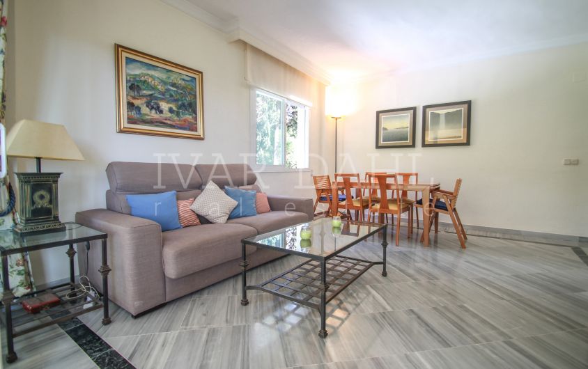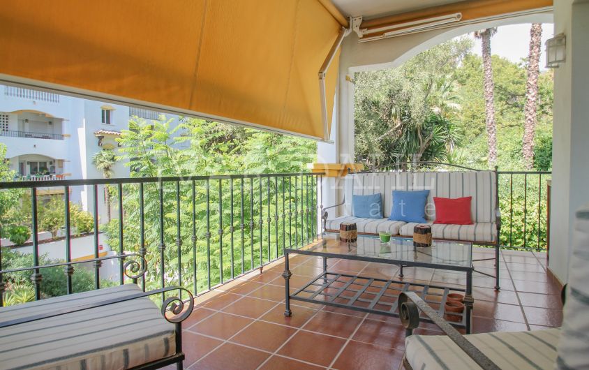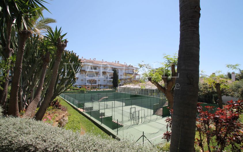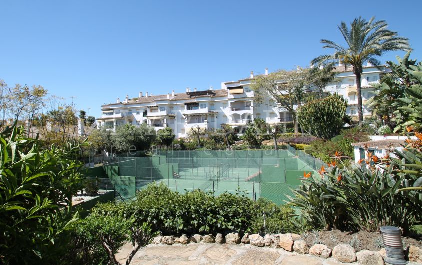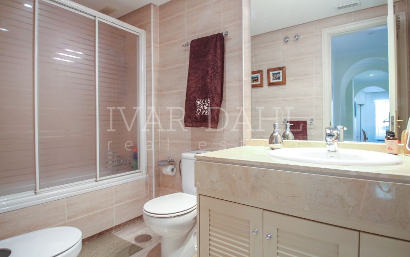 Entre sus zonas exteriores, destacan una terraza privada de 15m², parcialmente cubierta, desde la que se disfruta de agradables vistas al jardín comunitario. El complejo residencial ofrece una amplia gama de servicios como piscina de agua salada, jardines, pistas de tenis y pádel, ascensor, trastero y garaje comunitario. Se trata de una urbanización cerrada con servicio de portero, cámaras de vigilancia y seguridad 24 horas, lo que aporta tranquilidad y exclusividad a sus residentes.