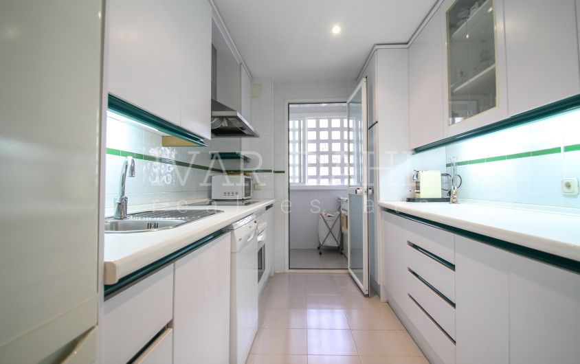La vivienda cuenta con tres amplios dormitorios, incluyendo un dormitorio principal con baño en suite, y un baño adicional, lo que garantiza funcionalidad y privacidad para toda la familia. El diseño interior se complementa con suelos de mármol, aire acondicionado, persianas eléctricas, armarios empotrados y una cocina totalmente equipada, además de una práctica zona de lavandería. El apartamento se entrega completamente amueblado, listo para entrar a vivir.