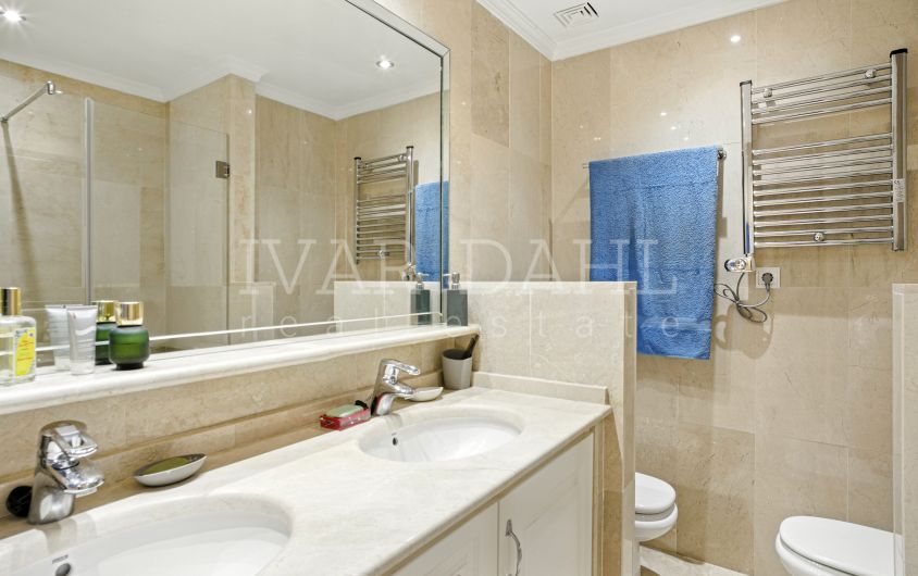 El apartamento consta de dos amplios dormitorios y dos baños, incluyendo uno elegante en suite, todos con acabados de alta calidad. La amplia superficie construida de 165 m² consta de 128 m² de sofisticado espacio interior, complementado por una generosa terraza privada de 37 m² que ofrece un entorno ideal para relajarse y disfrutar al aire libre mientras disfruta de las vistas al Mediterráneo. La propiedad también cuenta con suelos de mármol y armarios empotrados, lo que garantiza elegancia y amplio espacio de almacenamiento.