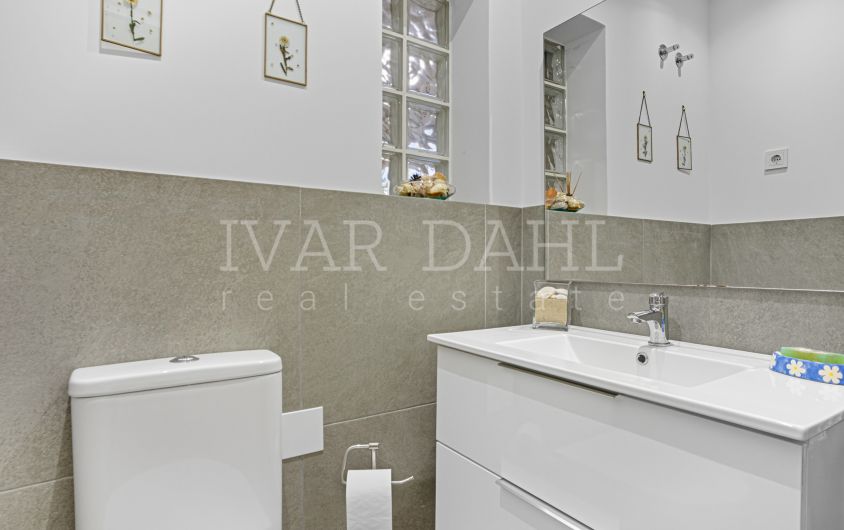 Entre sus características interiores destacan una cocina totalmente equipada, una acogedora chimenea y elegantes suelos de mármol. El salón da acceso directo a la terraza privada y al patio en planta baja, ofreciendo un espacio ideal para el ocio y el relax. Los dormitorios disponen de armarios empotrados y gozan de vistas parciales al mar y a la calle. La propiedad se encuentra en buen estado, aunque ofrece interesantes posibilidades de renovación para adaptarla al gusto personal.