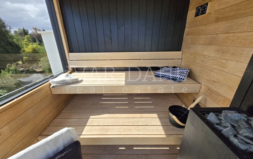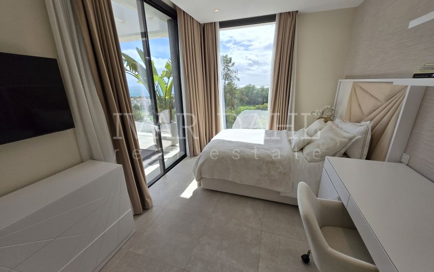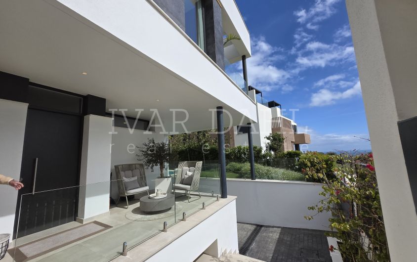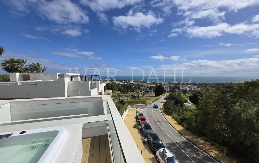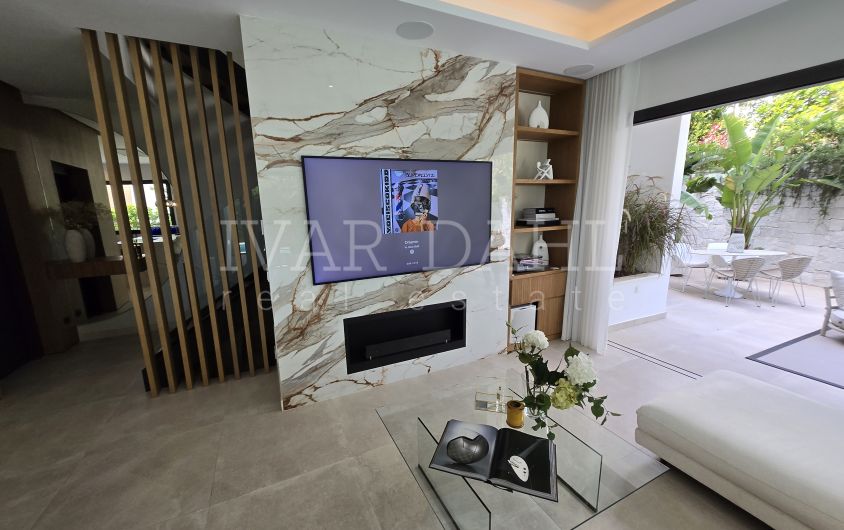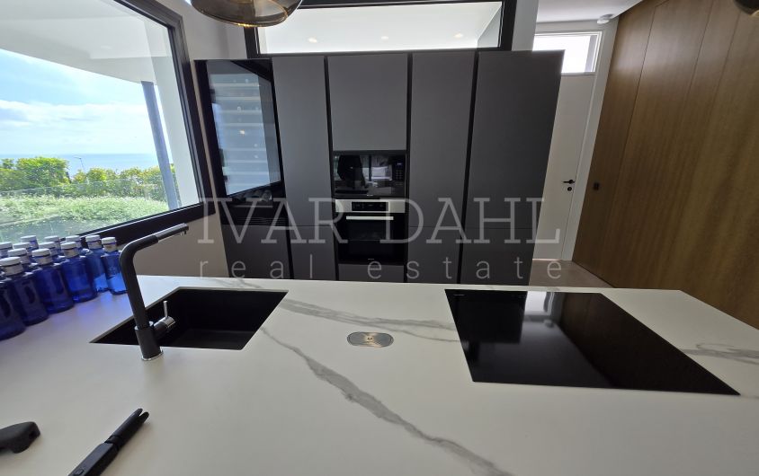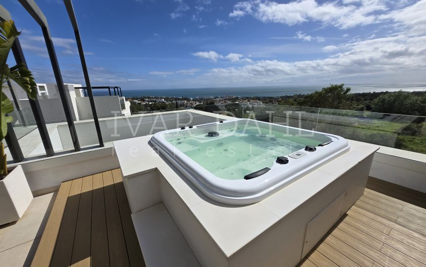Ny högkvalitativ parhusvilla i Sierra Blanca med öppen havsutsikt och lyxiga möbler. Byggt i 4 plan från källare till takterrass. Lyft till alla nivåer. Källare med stort garage för 2/3 bilar och skivspelare, grovkök och ett sovrum med eget badrum. Entréplan på entréplan: vardagsrum och matsal med stilfullt kök i öppen planlösning, gästtoalett, terrass och trädgård med privat uppvärmd pool med jetstream. Första våningen: Master bedroom med eget badrum plus ytterligare 2 sovrum som delar 1 badrum. Alla rum har stora fönster från golv till tak som släpper in en enorm mängd ljus. Översta nivån är takterrass med inbyggd jacuzzi med hisnande havsutsikt, bastu, utomhuskök, sittgrupp och utomhusdusch. Villan har utmärkt byggnadskvalitet och har uppgraderats. Det finns luftkonditionering och golvvärme överallt. Beläget bara 5 minuters bilresa från Marbella stad och strandpromenaden. Alla bekvämligheter, inklusive internationella skolor, ligger inom räckhåll. Denna villa är idealisk för ett bekvämt och lyxigt boende i Marbella.
