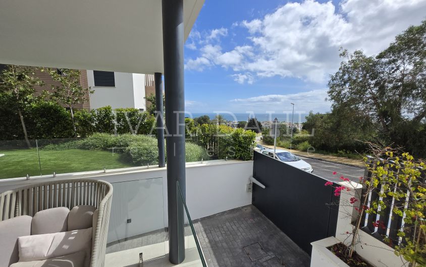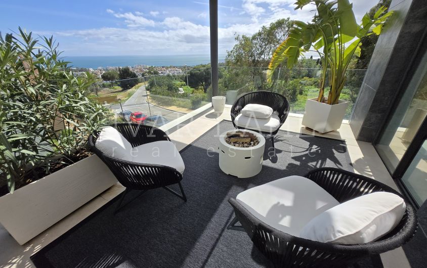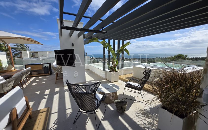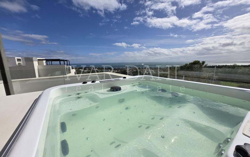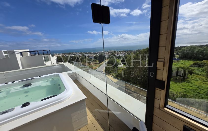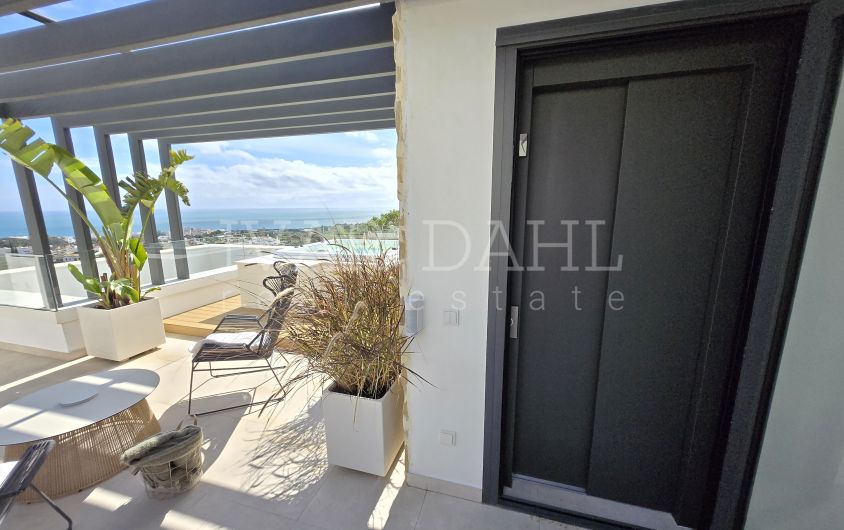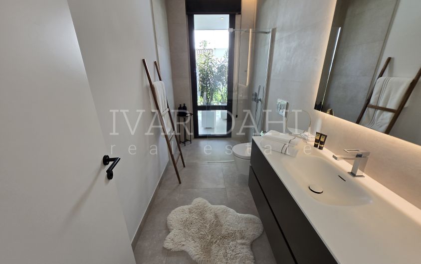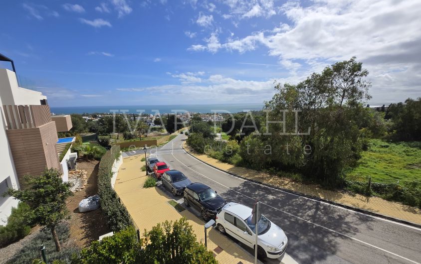 Ny högkvalitativ parhusvilla i Sierra Blanca med öppen havsutsikt och lyxiga möbler. Byggt i 4 plan från källare till takterrass. Lyft till alla nivåer. Källare med stort garage för 2/3 bilar och skivspelare, grovkök och ett sovrum med eget badrum. Entréplan på entréplan: vardagsrum och matsal med stilfullt kök i öppen planlösning, gästtoalett, terrass och trädgård med privat uppvärmd pool med jetstream. Första våningen: Master bedroom med eget badrum plus ytterligare 2 sovrum som delar 1 badrum. Alla rum har stora fönster från golv till tak som släpper in en enorm mängd ljus. Översta nivån är takterrass med inbyggd jacuzzi med hisnande havsutsikt, bastu, utomhuskök, sittgrupp och utomhusdusch. Villan har utmärkt byggnadskvalitet och har uppgraderats. Det finns luftkonditionering och golvvärme överallt. Beläget bara 5 minuters bilresa från Marbella stad och strandpromenaden. Alla bekvämligheter, inklusive internationella skolor, ligger inom räckhåll. Denna villa är idealisk för ett bekvämt och lyxigt boende i Marbella.