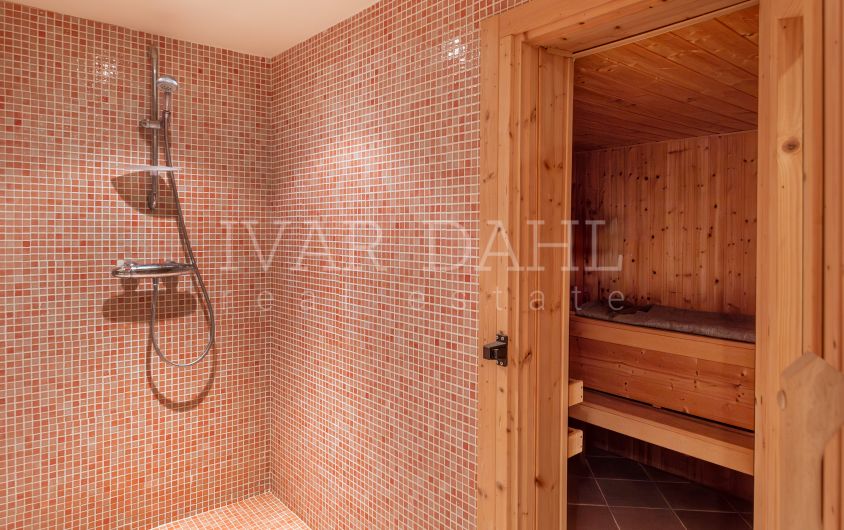 Beläget på en 1302m2 tomt, har villan ett totalt byggt område på 772m2, med 686m2 inre utrymme och 86m2 av terrasser. Designad över tre nivåer, den har fyra sovrum, fyra badrum och två en-suite bad, vilket ger gott om utrymme för familj och gäster.